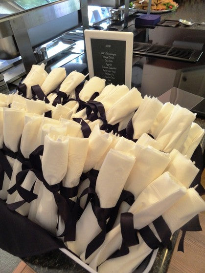 If you’ve already planned your menu, but want some additional congratulatory décor for your graduation party, these diploma napkins are a great choice. With either white cloth or white paper napkins, you can simply roll them up like a scroll and tie a black ribbon around them. This way, you’ll have a fun party element that will make people smile.